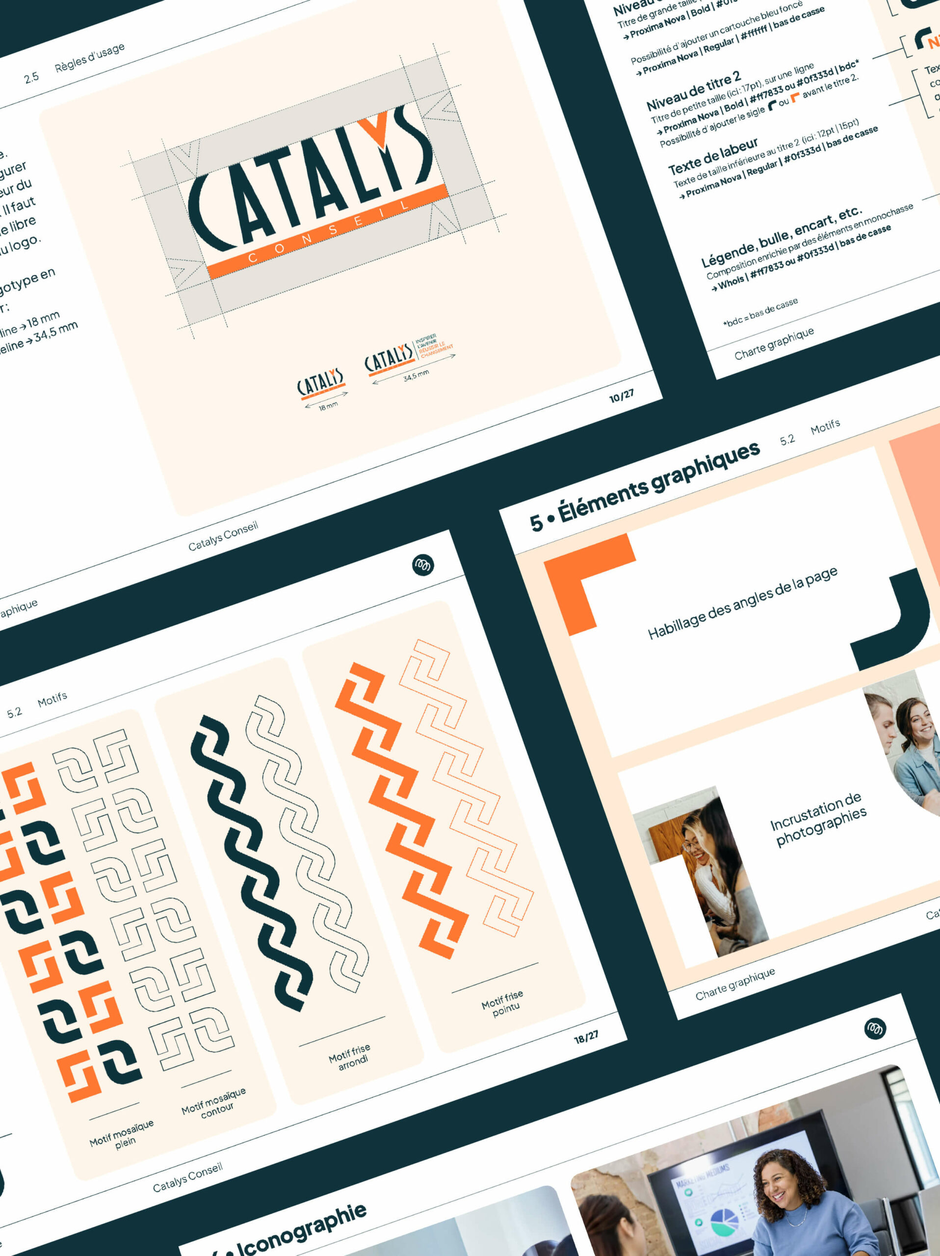 Les choix typographiques ont été standardisés pour une cohérence visuelle optimale, tandis que l’identité graphique s’enrichit d’une palette de couleurs dynamique, d’icônes donnant l’aspect humain et d’un ensemble de motifs inspirés du logotype.